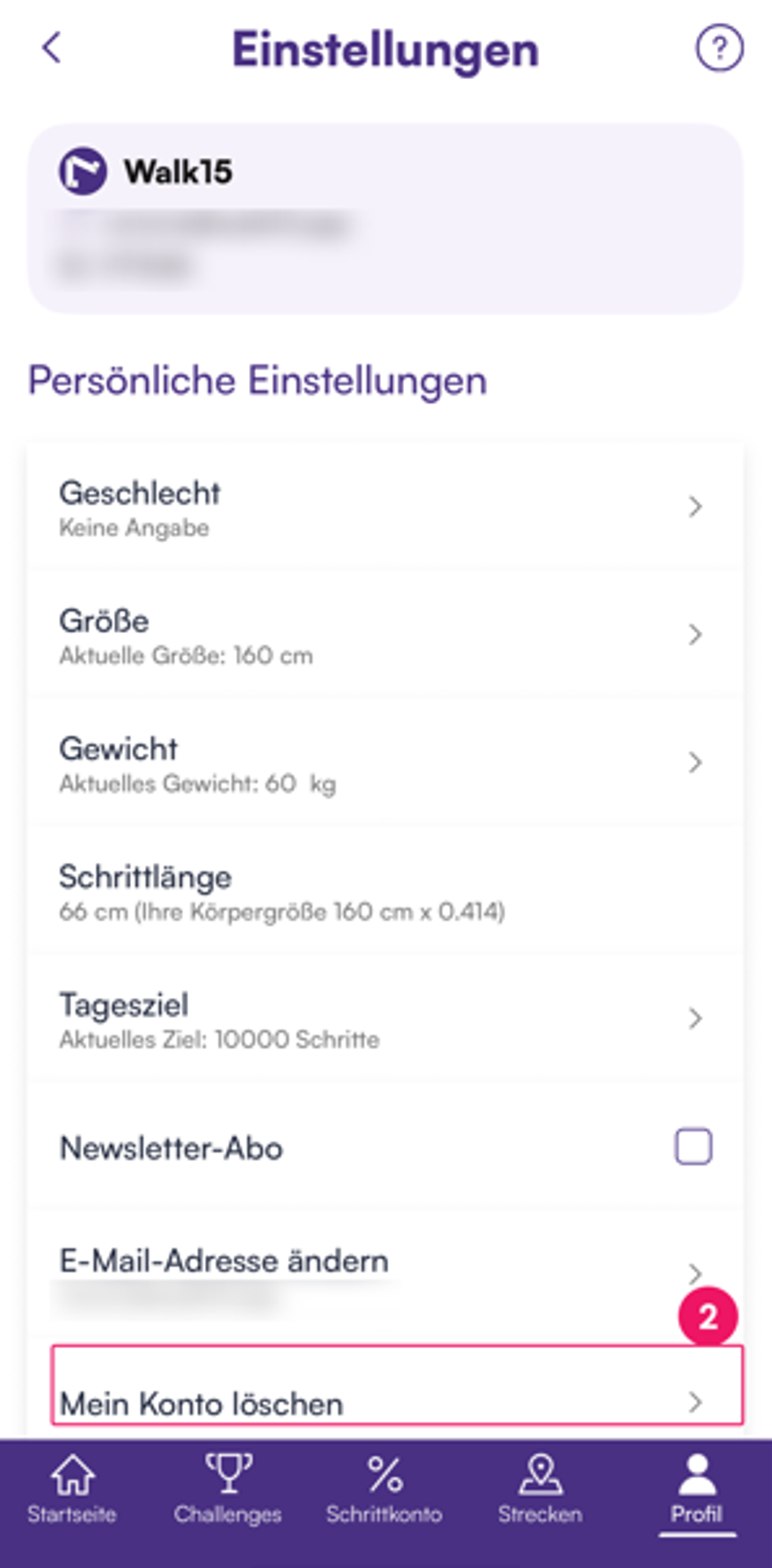 Wenn du dein Konto und alle zugehörigen Daten dauerhaft löschen möchtest, folge diesen Schritten in der Walk15-App: