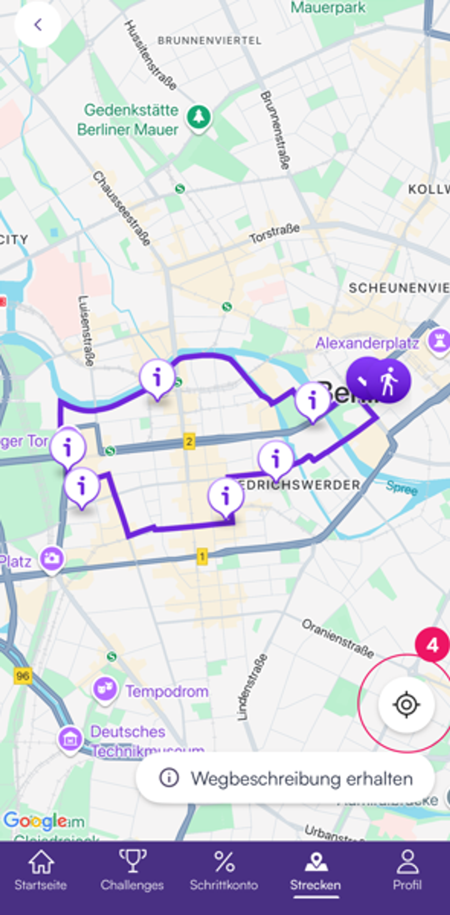 4. Tippe auf das Start-Symbol, um die Strecke von deinem aktuellen Standort aus zu beginnen.