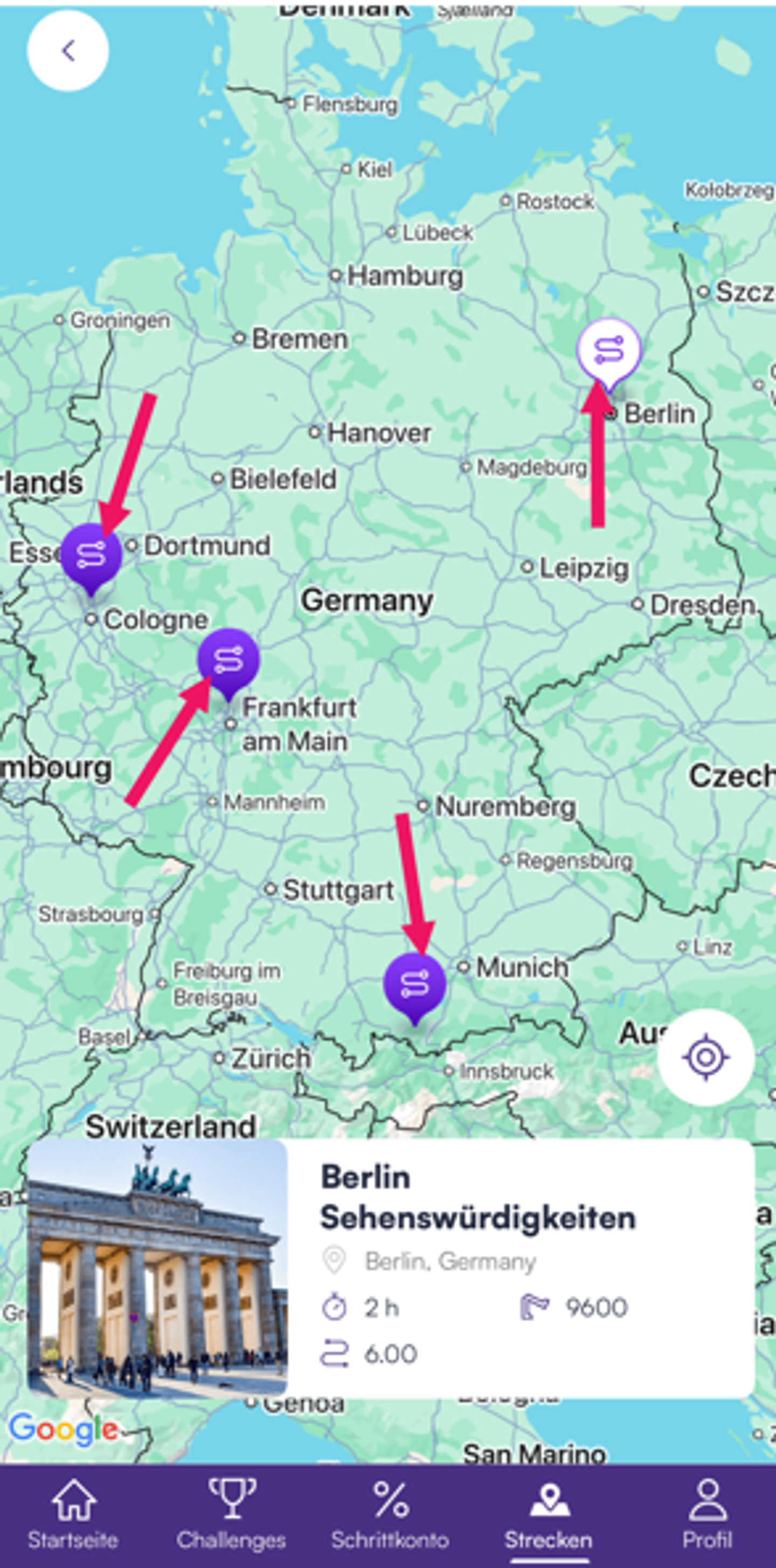 2. Auf der Karte siehst du die farbigen Pins mit Strecken - Tippe auf einen Pin, um die Zusammenfassung der Strecke zu sehen: