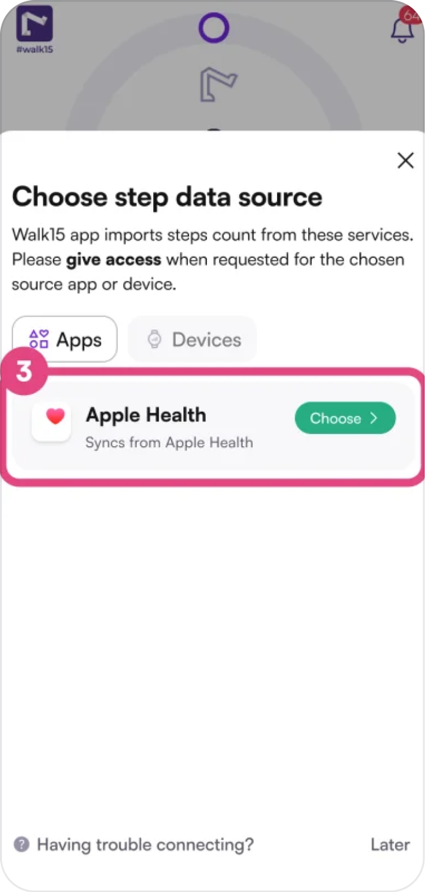 Return to the Walk15 app and check if your Health data is now visible. It may take a few minutes for the initial data sync to complete.