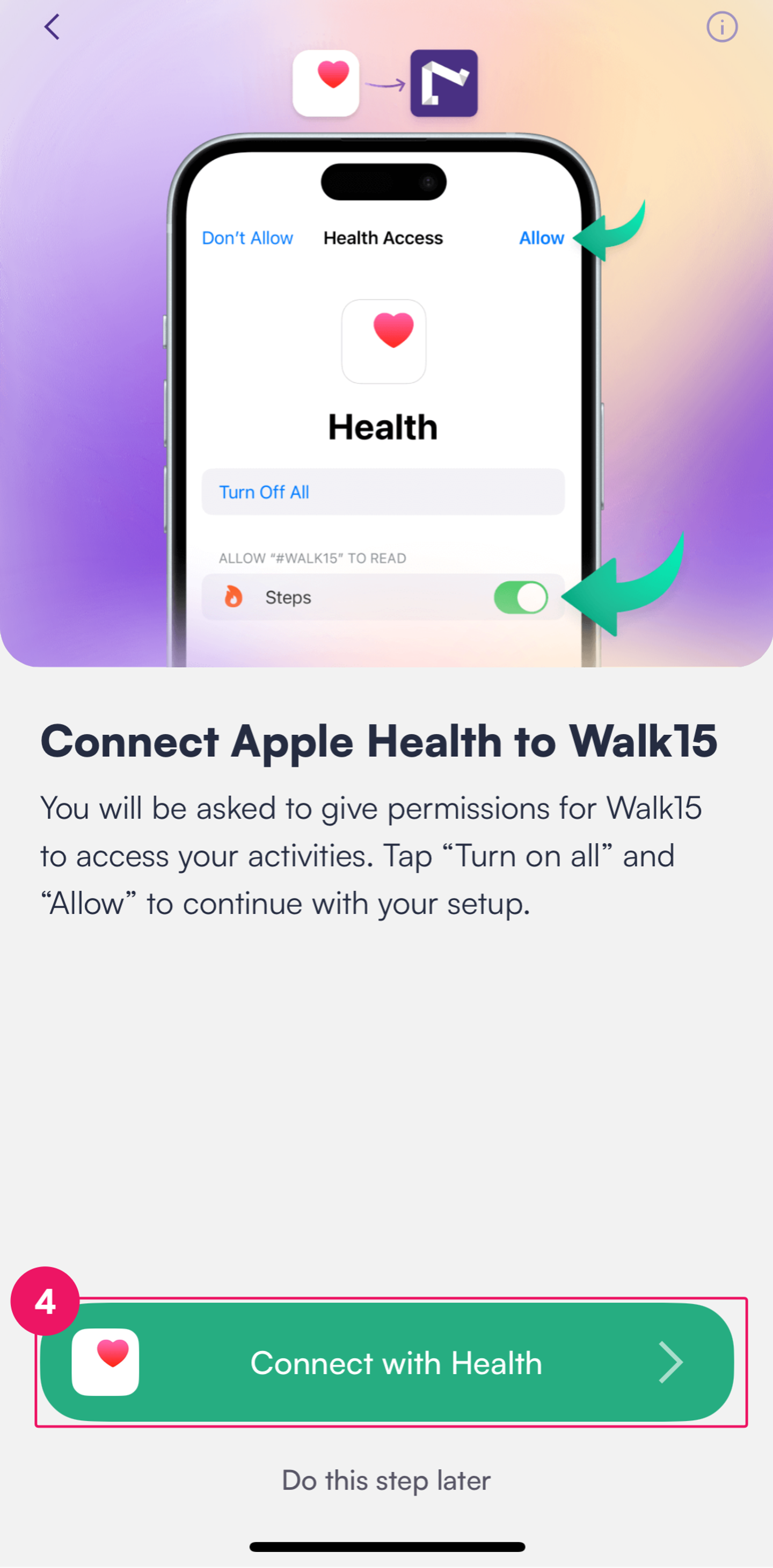 You will see a permission screen requesting access to your Health data. Enable the Steps toggle to allow Walk15 to read step count data from Apple Health.