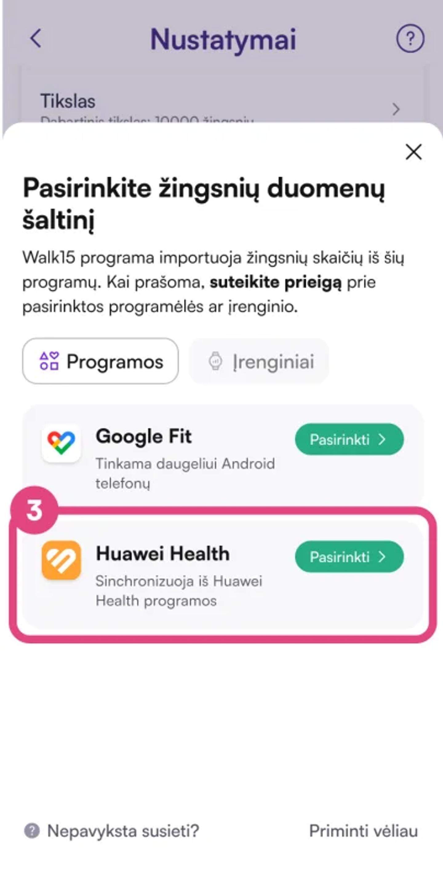 You’ll be asked to allow Walk15 to access your step data from Huawei Health. Follow the on-screen instructions to grant all required permissions so that Walk15 can accurately track and import your steps.