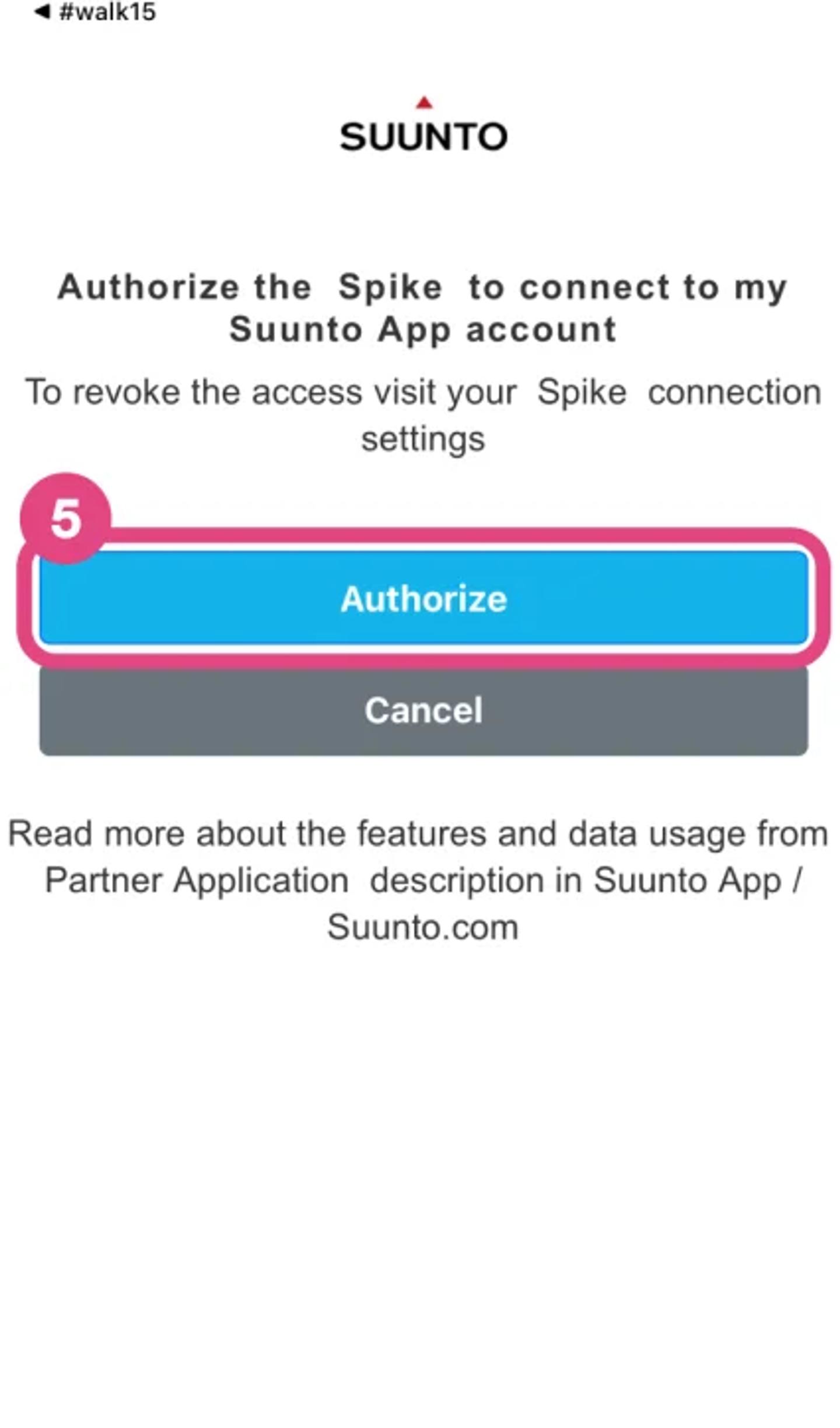 After logging in, you’ll encounter a prompt asking you to authorize the connection to your Suunto App account. Click 'Authorize' to allow synchronisation between Suunto and Walk15.