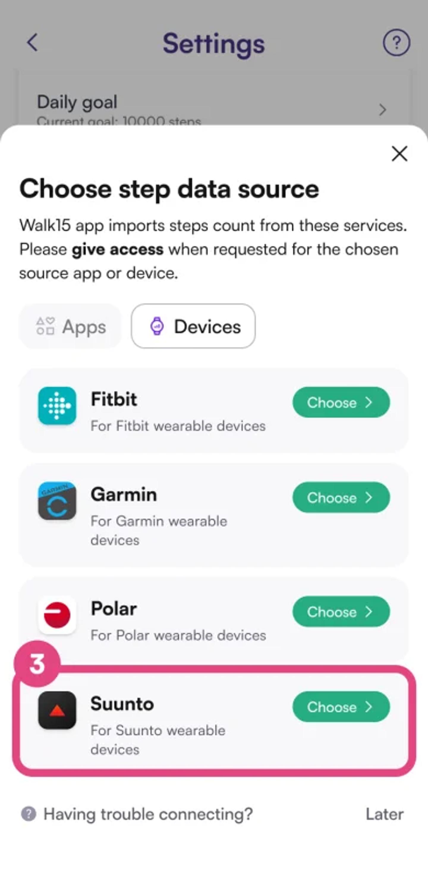 Within the 'Steps provider' settings, tap on 'Devices' and then select 'Suunto' from the list to start the sync process.