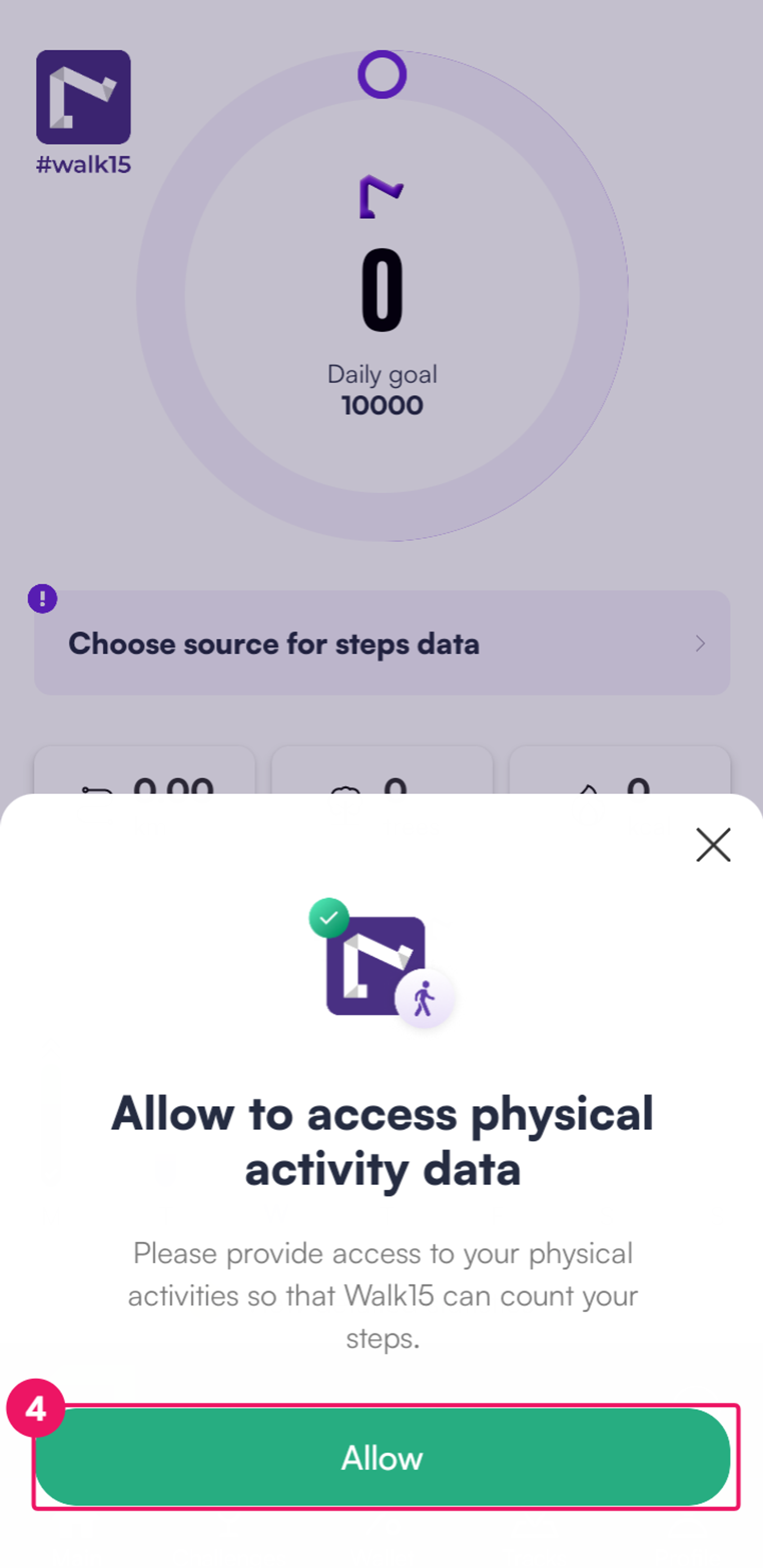 You will see a permission screen requesting access to your physical activity data. Tap Allow button below to provide access to your physical activities so that Walk15 can count your steps: