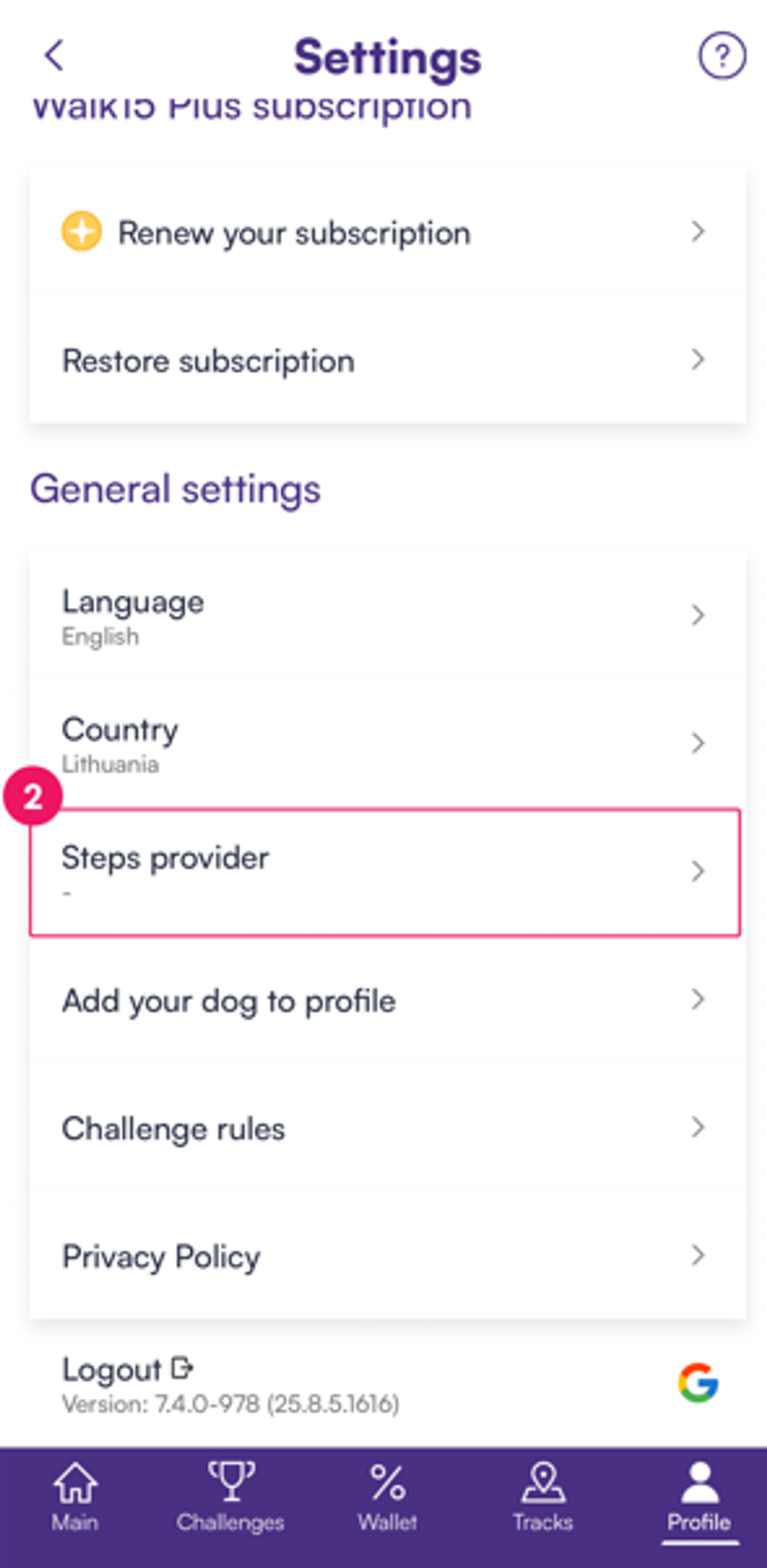 In the Settings menu, scroll until you find General settings. Under this section, tap on Steps provider: