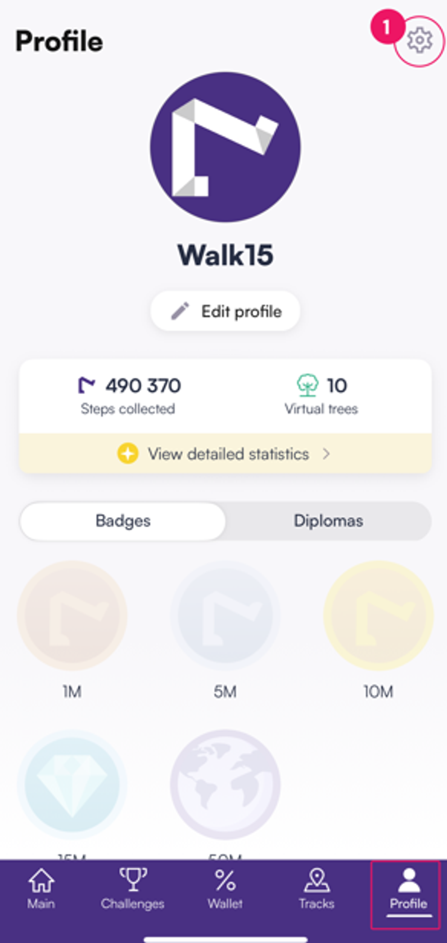 Tap Profile tab in the Walk15 app, then click the gear icon in the top corner to access Settings: