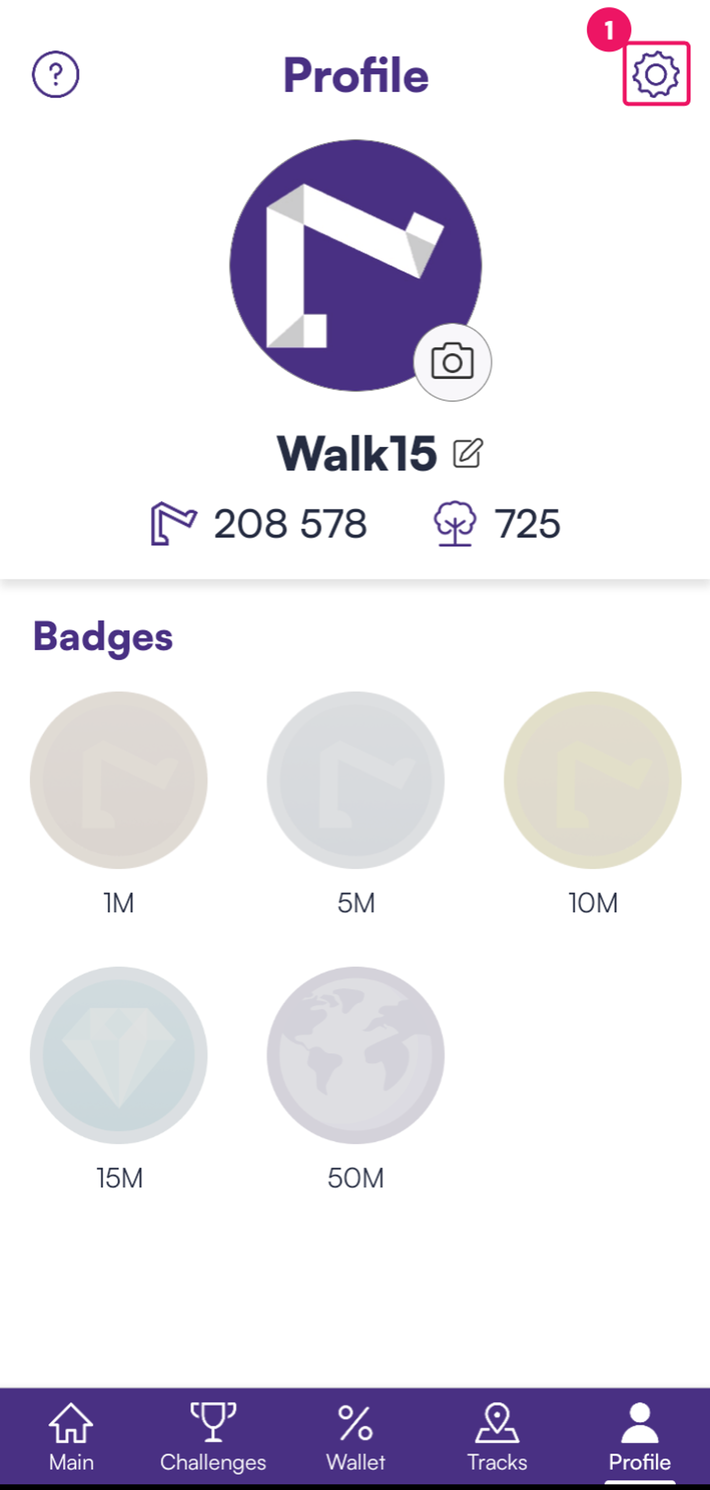 Pieskaries cilnei “Profils” lietotnē Walk15, tad noklikšķini uz zobrata ikonas augšējā stūrī, lai atvērtu “Iestatījumi”: