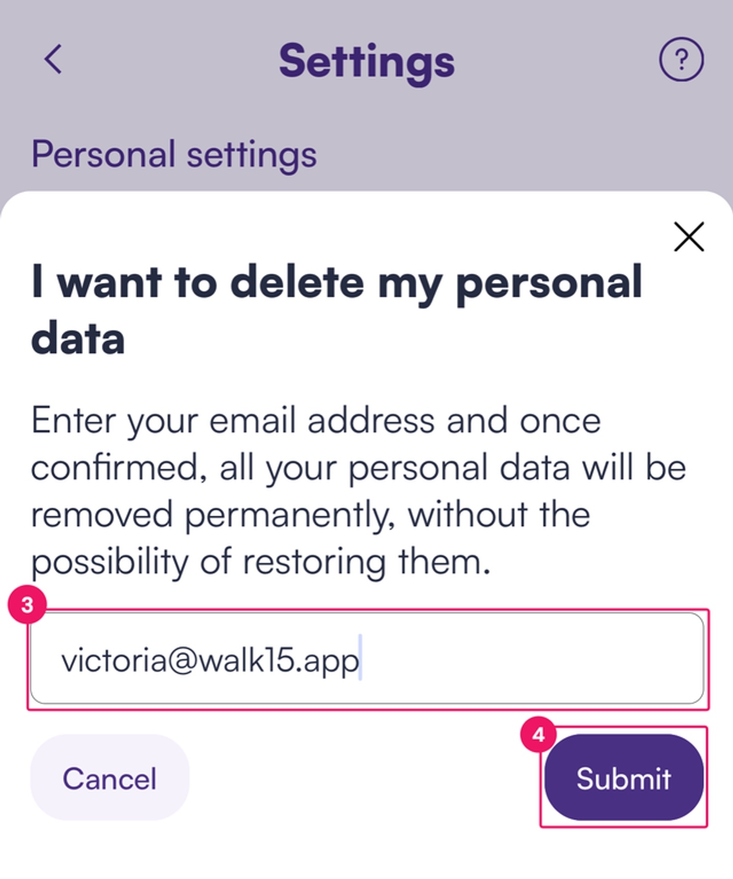 Ja vēlies neatgriezeniski izdzēst savu kontu un visus ar to saistītos datus, veic šādas darbības lietotnē Walk15: